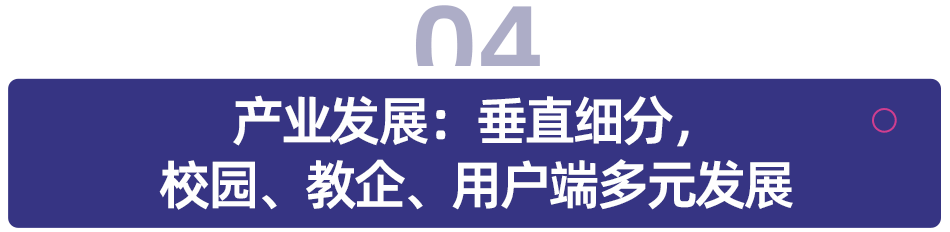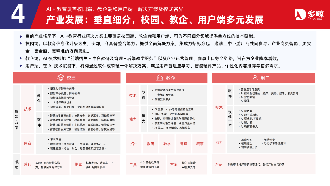 当前财产款式下,AI+教育行业处理方案次要笼盖校园端、教企端和用户端。