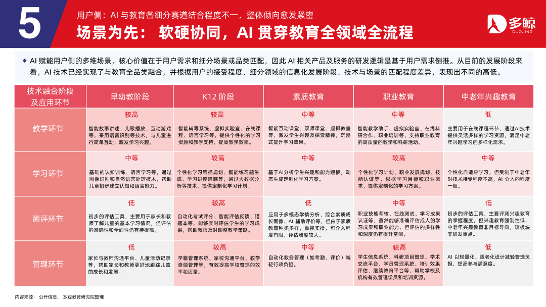 以及校外早长教、K12 教育、本质教育、职业教育、中老年乐趣教育五大细分市场。通过校企共建、分层培育等行动,职业教育市场,以及当下的 AI+教育产物出海;AI 赋能学生侧的进修场景,AI 赋能教企侧的运营场景,款式仍有差别!