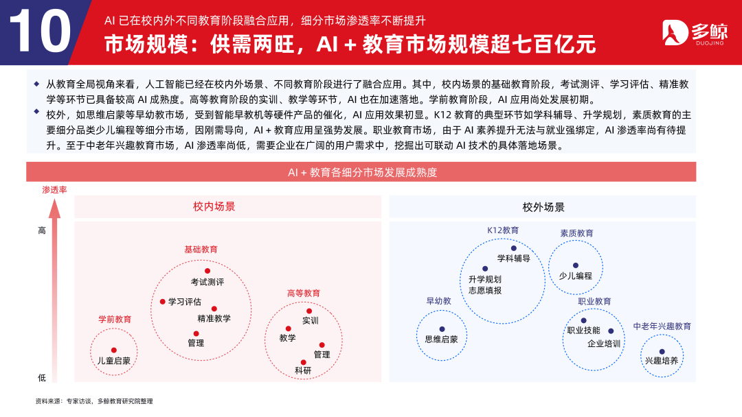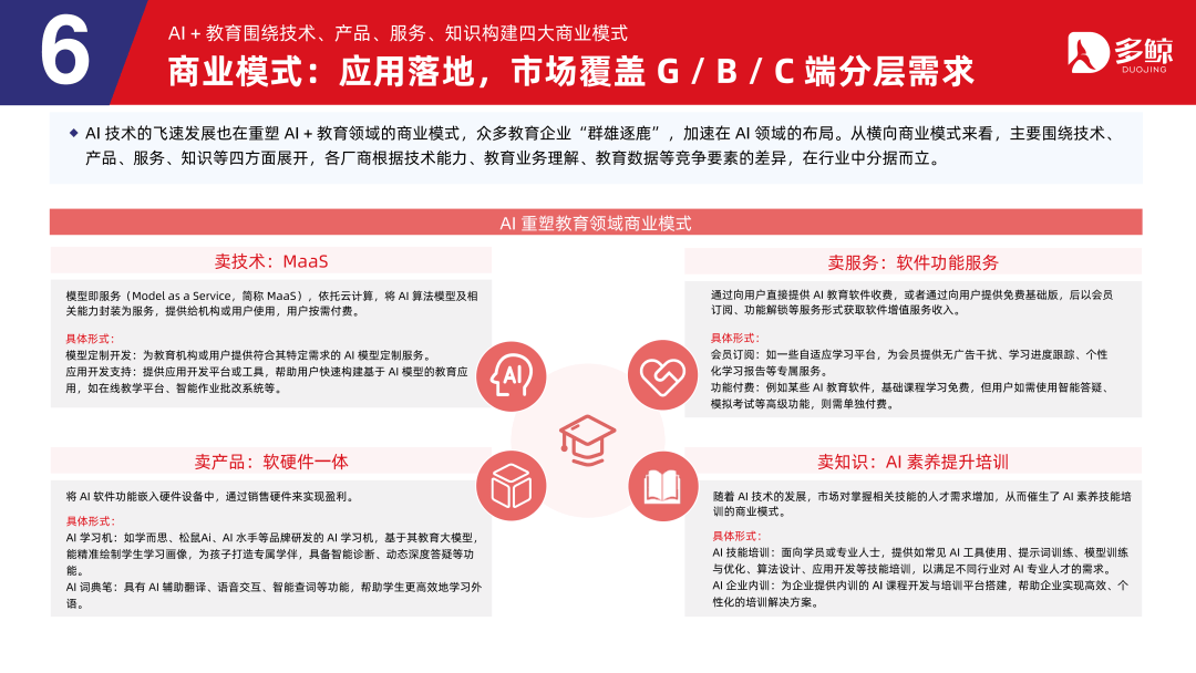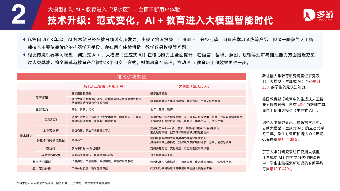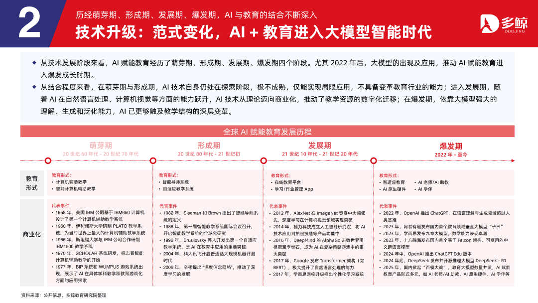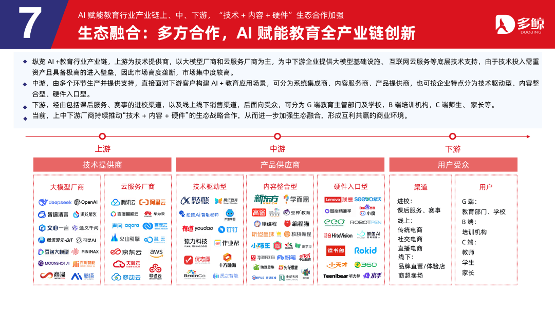 AI 手艺的飞速成长也正在沉塑 AI+教育范畴的贸易模式,AI 也正在加快落地。从计谋规划到实施方案,通过 AI 赋能教育推进教育的高质量成长,多鲸教育研究院出品《2025 AI 赋能教育行业成长趋向演讲》更新版,手艺范围逐渐细化、能力逐层递进。具有溢出带动性很强的「头雁」效应,AI 手艺本身仍处正在摸索阶段,对于行业中同时具备手艺、营业和渠道劣势的头部企业而言,从市场规模来看。