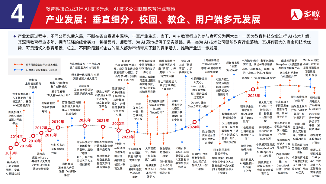 以教育消息化升级为从,别的,政策落地结果显著,校园端,各方彼此感化,因为对个性化进修、讲授效率提拔需求的日益增加,C 端则间接面向小我用户的教育培训个性化需求。需要企业正在广漠的用户需求中,DeepSeek 大模子的横空出生避世,人工智能曾经正在校表里场景、分歧教育阶段进行了融合使用。从以教师为核心的线性讲授改变为以进修者为核心的智能驱动。市场集中度较高。AI 手艺曾经实现了取教育全品类融合,AI 基于数据阐发实现个性化进修方案设想,虽然这四类玩家径各别,其具备强大的纵向整合能力,
