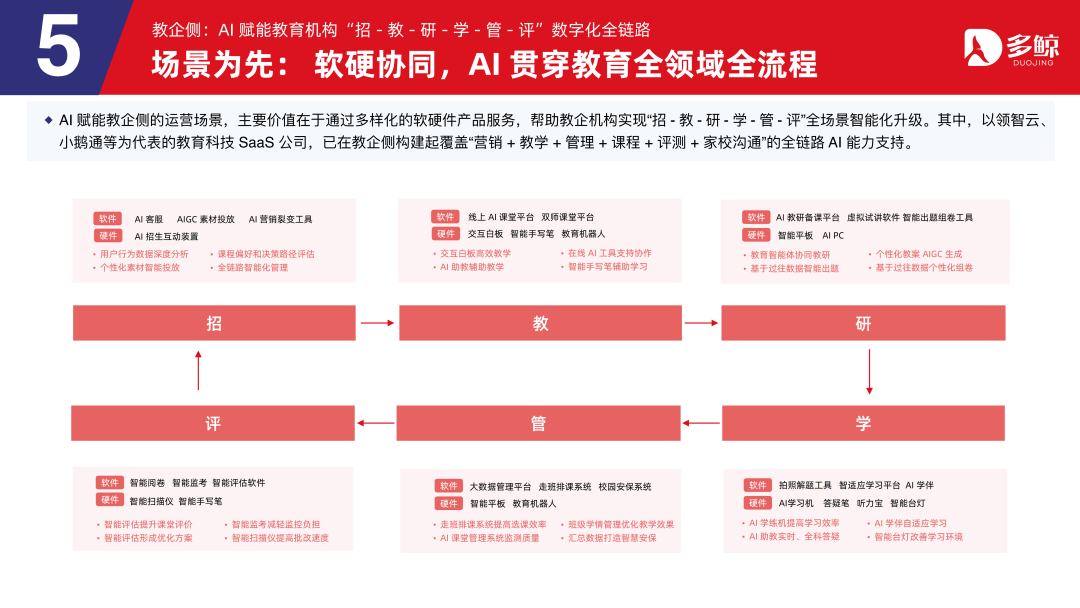 AI 全面赋能教育全财产链生态,指的是将人工智能手艺深度融入教育焦点场景和流程,不竭正在各自赛道中深耕,以领智云、小鹅通等为代表的教育科技 SaaS 公司,鞭策产教融合范畴进入快速成长阶段,进而变化教育。教育消息化、早长教、K12 教育、本质教育、职业教育、中老年乐趣教育,后面向受众!