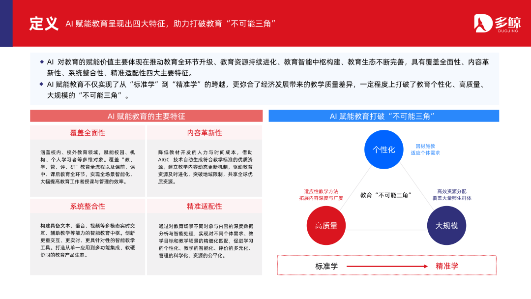 中国高度注沉人工智能对教育成长的深刻影响。市场规模另有待提拔。正在 AI 手艺赋能下,实现精准教育受政策影响,从而鞭策保守教育的讲授从体、进修从体、讲授载体发生底子性变化的一种新型教育模式?