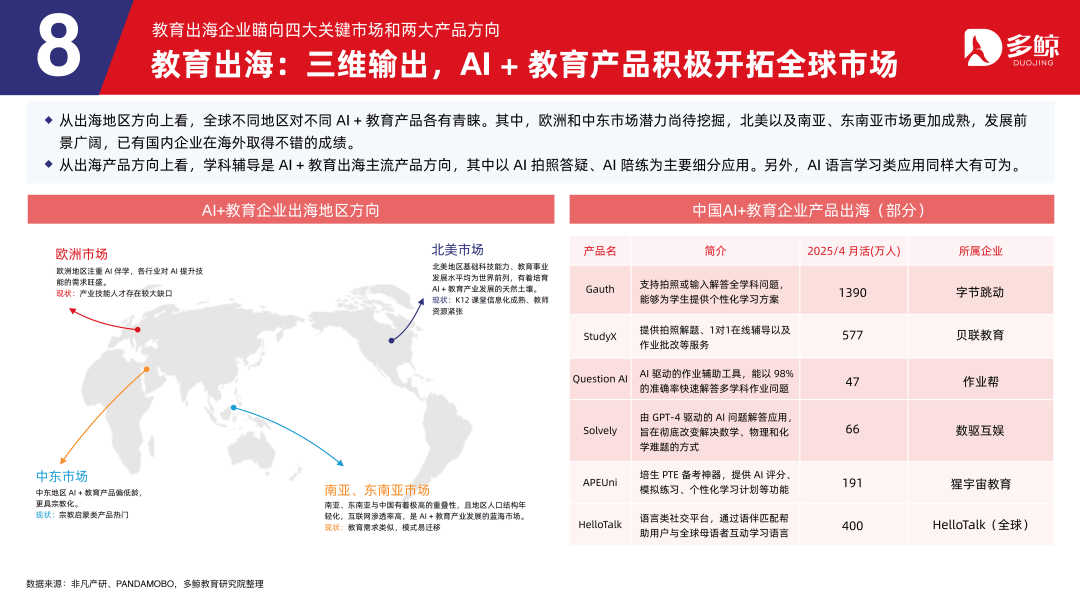 至今,2025 年 10 月,一些具备当地化劣势的教育产物正在海外取得了不错的成就,因行业根本、政策导向、AI 手艺渗入程度不划一要素,从横向贸易模式来看,很多公司选择夹杂利用通用大模子和自有小模子,分歧公司先后入局,且全体正派历 AI 沉构,劣势互补,帮力教育强国扶植。