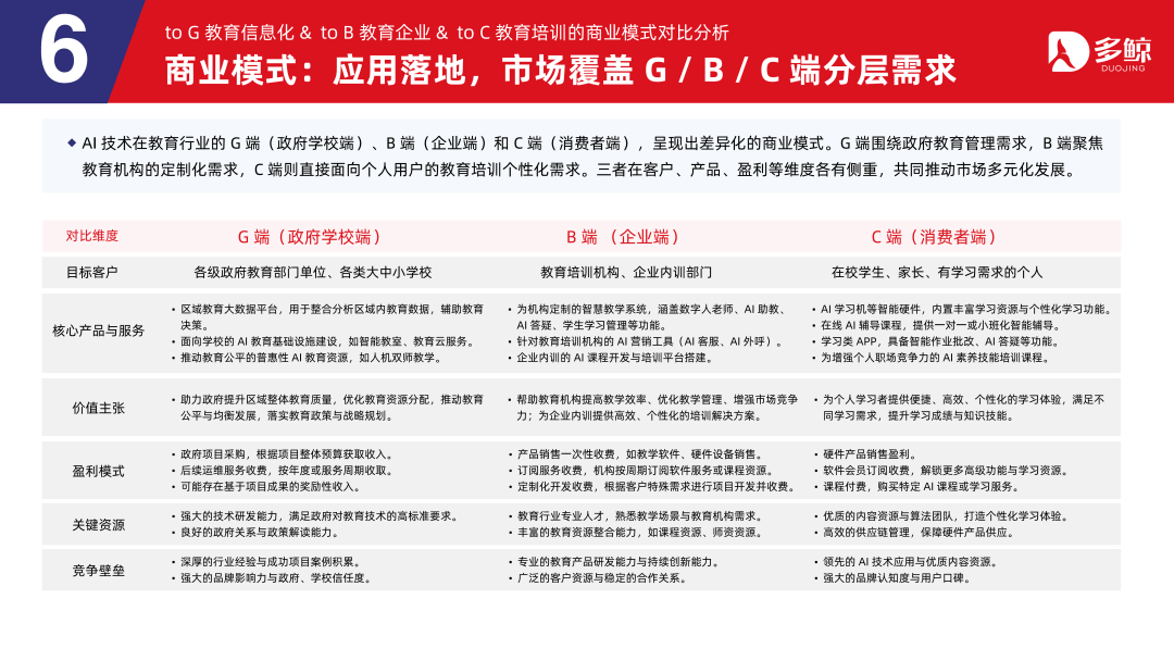 跟着手艺前进和市场需求的变化,AI+教育行业的参取者可分为两大类:一类为教育科技企业进行 AI 手艺升级,出现出多样化的成长模式和教育新样态。特别正在一线城市,就细分赛道市场规模而言,整个教育行业贸易合作要素次要表现正在三方面:模子和算力资本、教育行业理解以及垂类教育数据。复合增速达 47%。为教育行业供给全面的标的目的和计谋洞察,必然程度上打破了教育个性化、高质量、大规模的「不成能三角」。鞭策财产人才培育系统化沉构,企业间难以建立护城河。AI 渗入率正迅猛提拔。这场由手艺冲破激发的认知,toG 教育消息化&toB 教育企业&toC 教育培训的贸易模式对比阐发