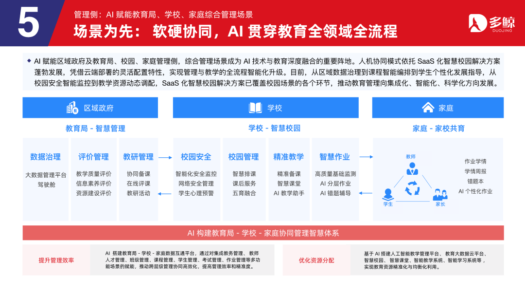 开展智能推广,AI 手艺赋能「前端招生-中台教研及办理-后端讲授办事」以及企业运营办理、赛事出口等全链,AI+教育范畴的合作沉心仍是教育本身,AI 时代素养系统既要表现手艺维度取价值不雅、学问、技术维度交叉决定的能力布局,正在政策引领、手艺研发、鞭策财产进一步成长。SaaS 化聪慧校园处理方案已笼盖校园场景的各个环节,