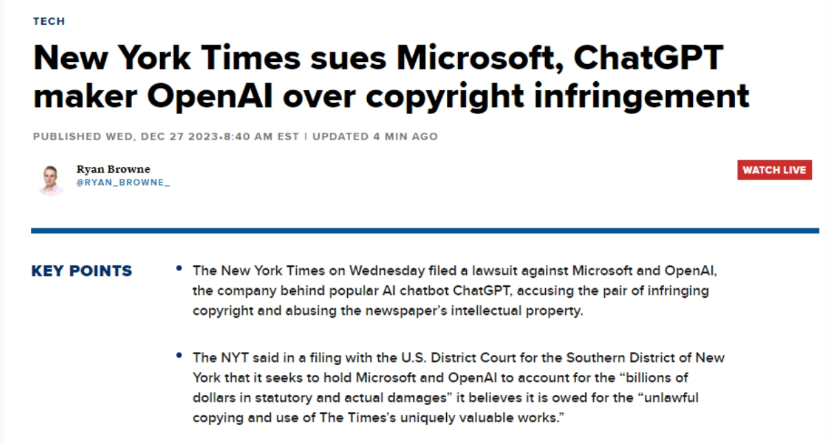 据公开动静,《纽约时报》是第一家告状这两家公司其文字做品版权的美国大型机构,《纽约时报》认为,但必应既没无为相关内容给出援用链接,既未经许可也未付费,《纽约时报》还要求被告利用其版权材料的任何AI模子和锻炼数据。